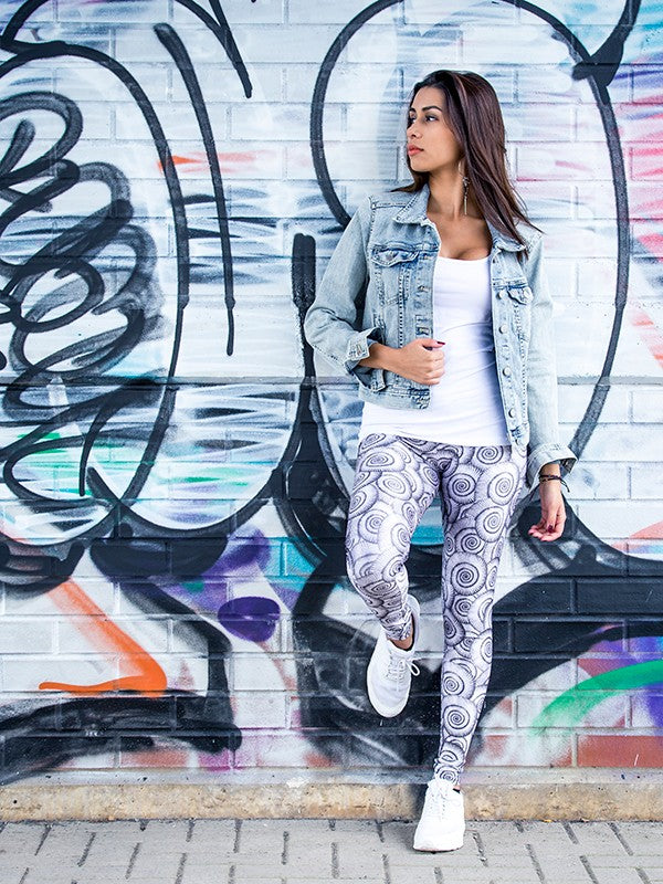 TILTED FRIDAY Crustacean Leggings shows a snail-fossil allover print in grey tones on a white background.