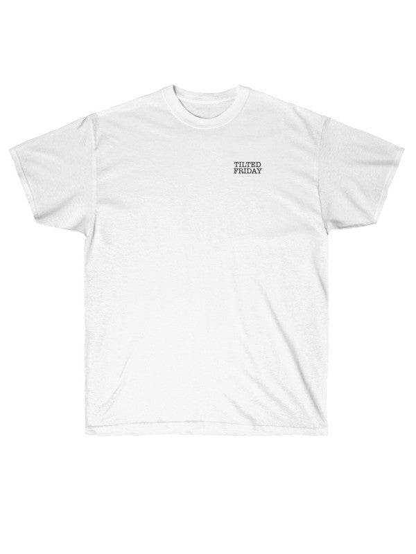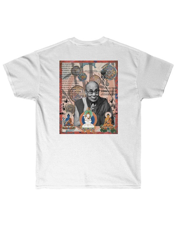 featuring the Tilted Friday lettering on the chest and a collage print about Dalai Lama on the back.