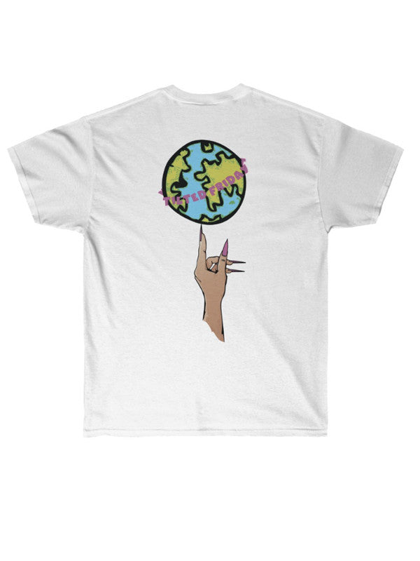TILTED FRIDAY We Run The World T-Shirt features a small globe with Tilted Friday lettering on the chest and the same globe with writing with a female hand as a back print.